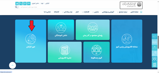 ابتدا وارد سایت مجتمع به آدرس https://ec.sums.ac.ir شده، به یکی از سه روش زیر وارد صفحه امورکارکنان شوید: