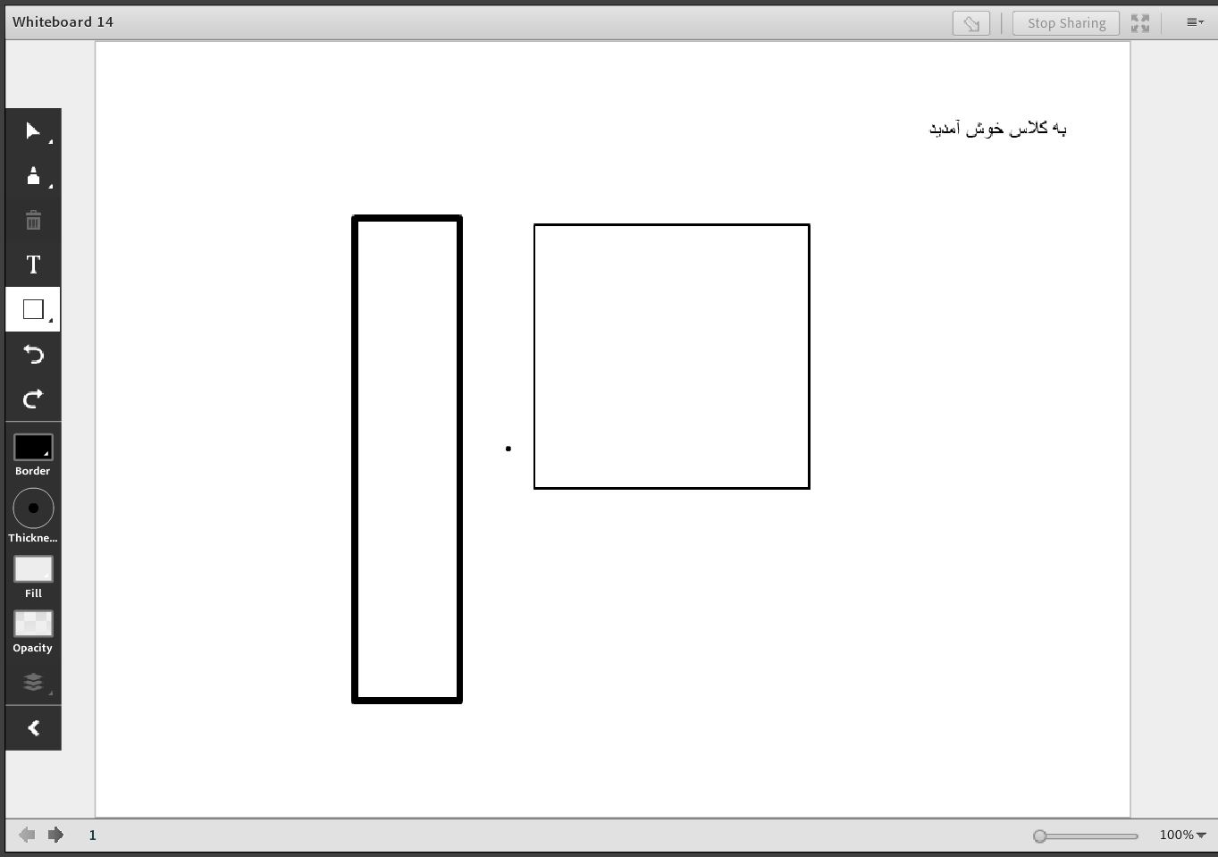 یکی از ابزارهایی که در اختیار مدرس و یا مدیر جلسه قرار دارد، تخته وایت برد است. از این تخته میتوانید برای ترسیم اشکال، نوشتن فرمولها و یا هر متن دیگری برای شرکتکنندگان استفاده کنید. برای استفاده از این قابلیت، در پنجره Share علاوه بر گزینههای Screen (مربوط به صفحه دسکتاپ) و Document (مربوط به اشتراکگذاری فایل) گزینه دیگری تحت عنوان whiteboard نیز وجود دارد که با کلیک روی آن، وارد پنجره سفیدی خواهید شد. از این طریق میتوانید متن، شکل، فرمول و یا... را در آن وارد کنید. در نوار کنار وایت برد، گزینههایی برای ترسیم اشکال هندسی، نوشتن text و یک آیکون مداد برای استفاده از قلم نوری که قابلیت تغییر اندازه قلم و رنگ آن را نیز دارا است، وجود دارد.