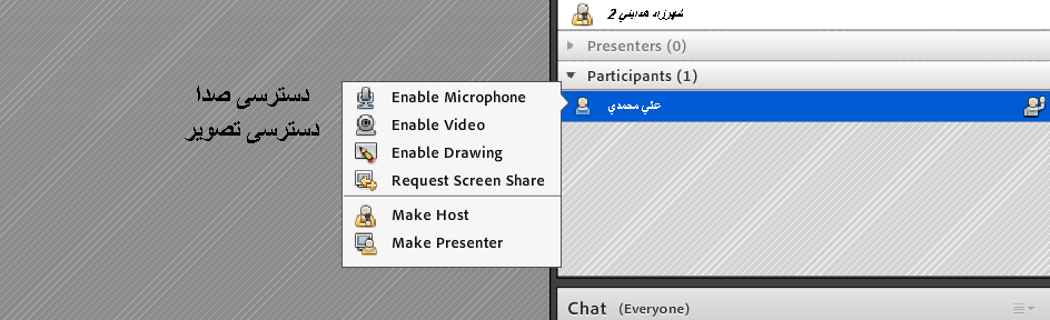 مدیر جلسه یا استاد بعد از بررسی درخواست کاربر با کلیک بر روی اسم کاربر مورد نظر می تواند دسترسی ویدئو و یا صوت را به شما میدهد و حتی امکان تغییر وضعیت از حالت شرکت کننده به ارائه دهنده را انجام دهد.